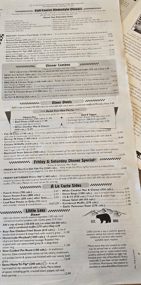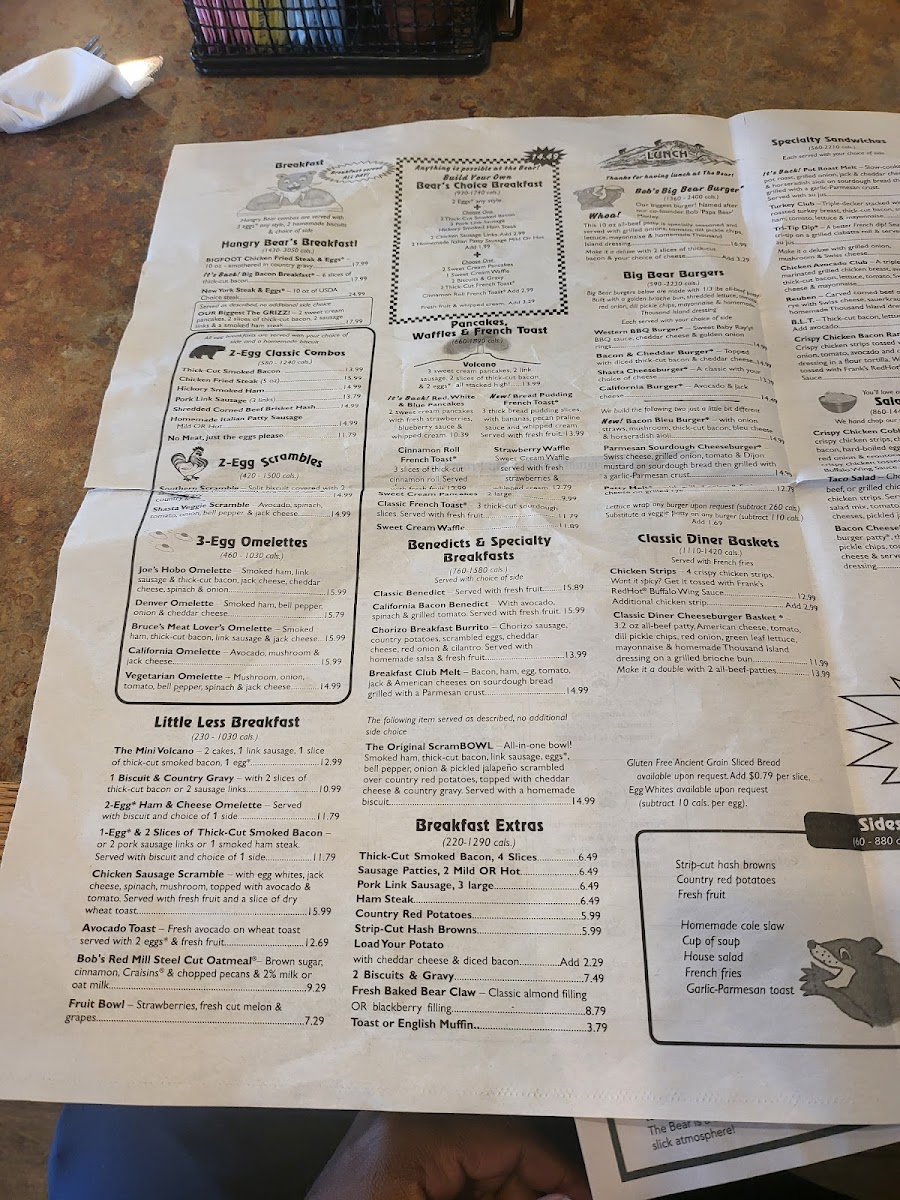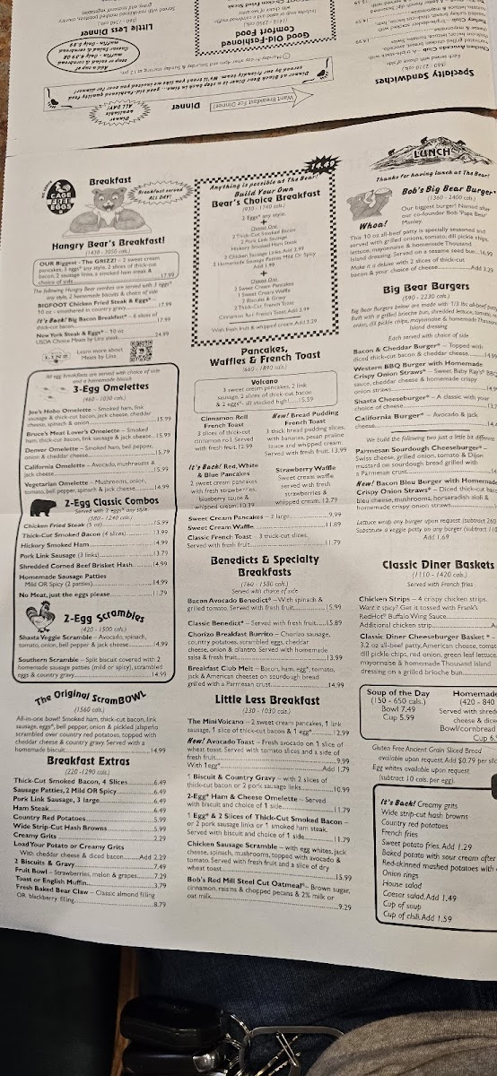 4 Bear Paw Chicken Fried Steaks with country gravy, served with 8 Scrambled eggs, 4 housemade biscuits and your choice of strip-cut hash browns or country red potatoes.